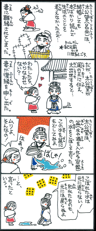 【覆水盆に返らず(ふくすい ぼんにかえらず)】(『拾遺記』)