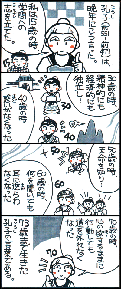 【志学、而立、不惑、知命、耳順、従心(しがく、じりつ、ふわく、ちめい、じじゅん、じゅうしん)】(『論語』)