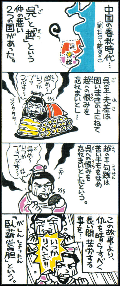 【臥薪嘗胆(がしんしょうたん)】(『史記』「嘗胆」の形でみえる) 仇を晴らすべく長い間苦労を重ねること。 転じて、将来の成功のために長い間苦労すること。