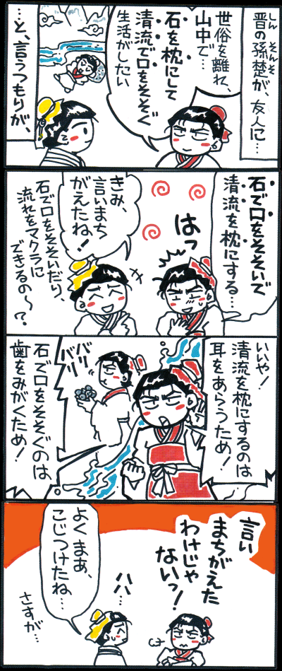(夏目漱石(なつめそうせき)の号「漱石」は、この故事から)