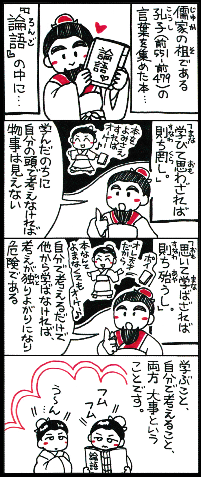 【学びて思わざれば則ち罔し、思いて学ばざれば則ち殆うし(まなびておもわざればすなわちくらし、おもいてまなばざればすなわちあやうし)】(『論語』)