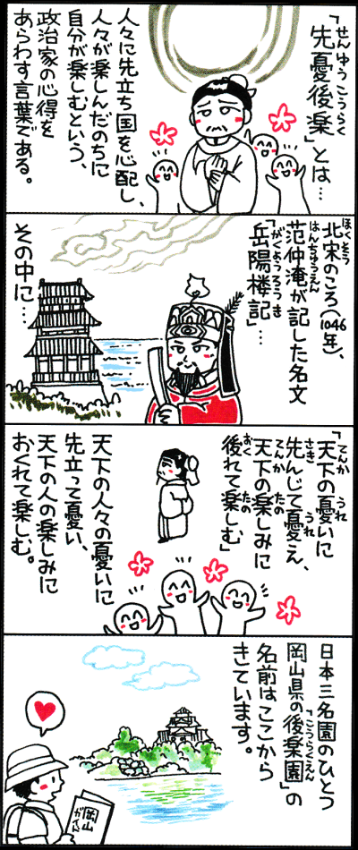 為政者の心得をとく言葉。人々に先立ち国を心配し、人々が楽しんだのちに自分が楽しむ。