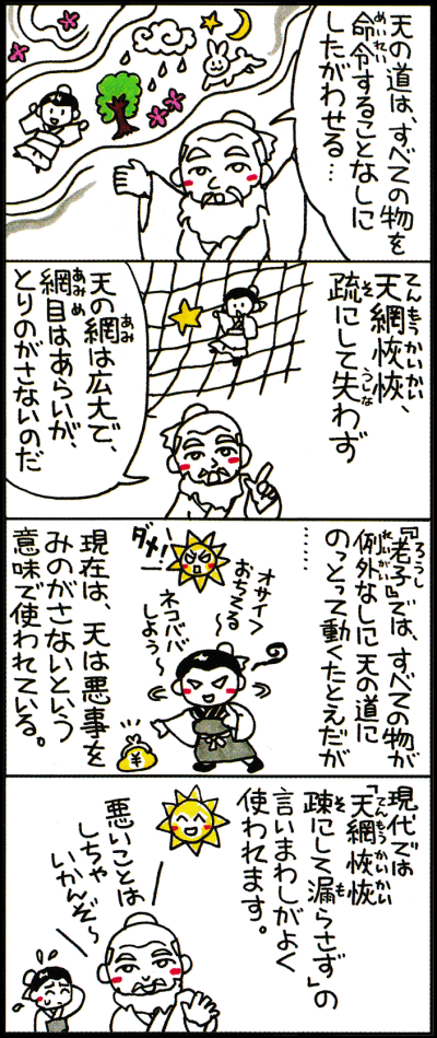 天の網は広大で目が粗いが、取り逃さない。悪事をすれば必ず天罰がくだること。